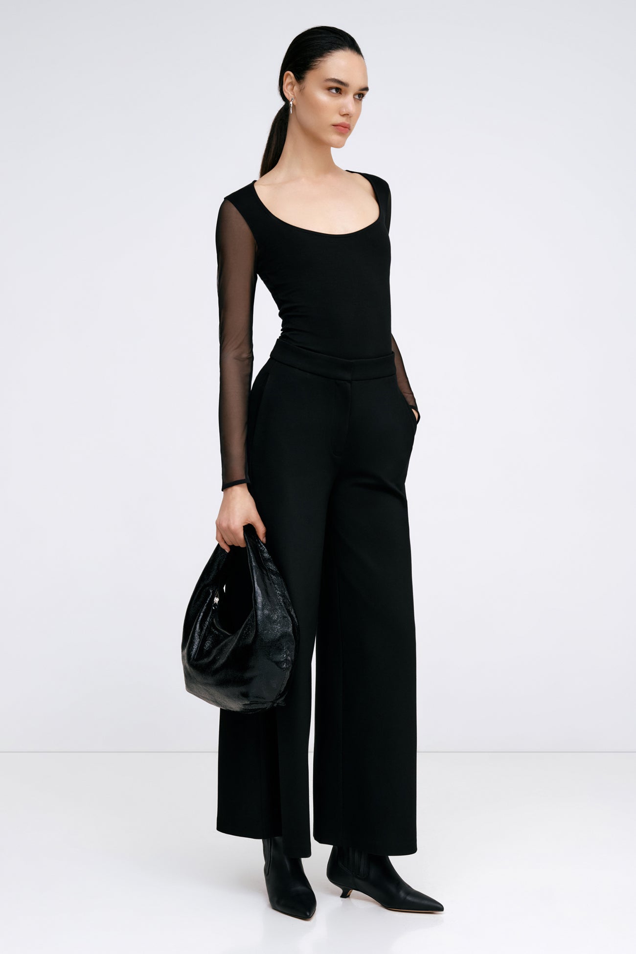 One closet staple. two textures. infinity style. Combining a hugging fit and scoop neck silhouette in sustainable European jersey with fitted sleeves in soft luxe mesh. our Parisa is "throw-her-on-and-go" for any setting - casual to cocktail. She's effortless elegance. SPLIT