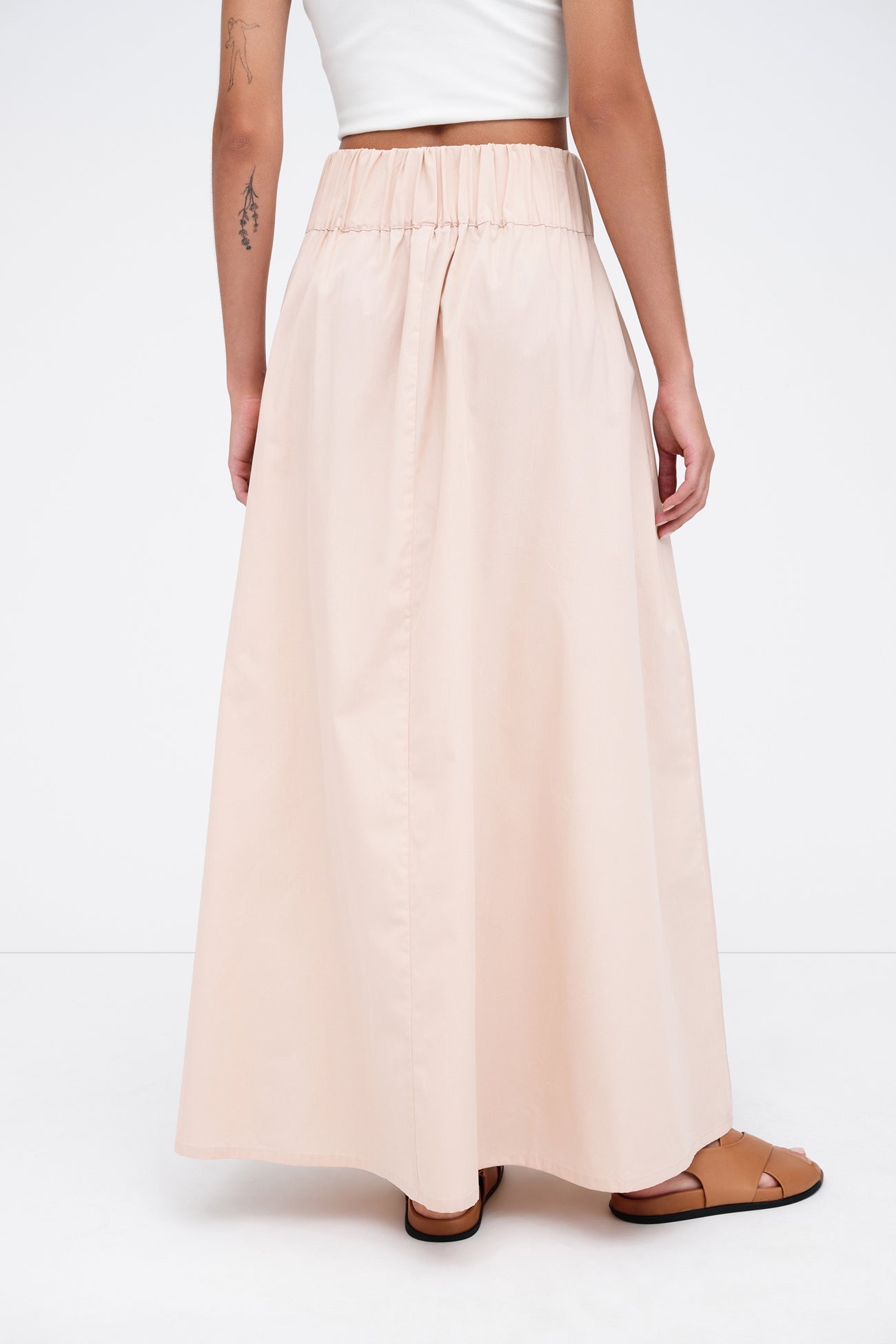 Our Raven Skirt has it all. A maxi skirt in flowy European poplin cotton (with pockets). she delivers grace and comfort for your everyday warm weather wardrobe. Raven's wide waistband is elasticated at the back. making her gather beautifully with a forgivingly flexible fit. Perfect for weekends. Raven is also vacation-ready—try her styled over swimsuits as a chic cover-up. SPLIT