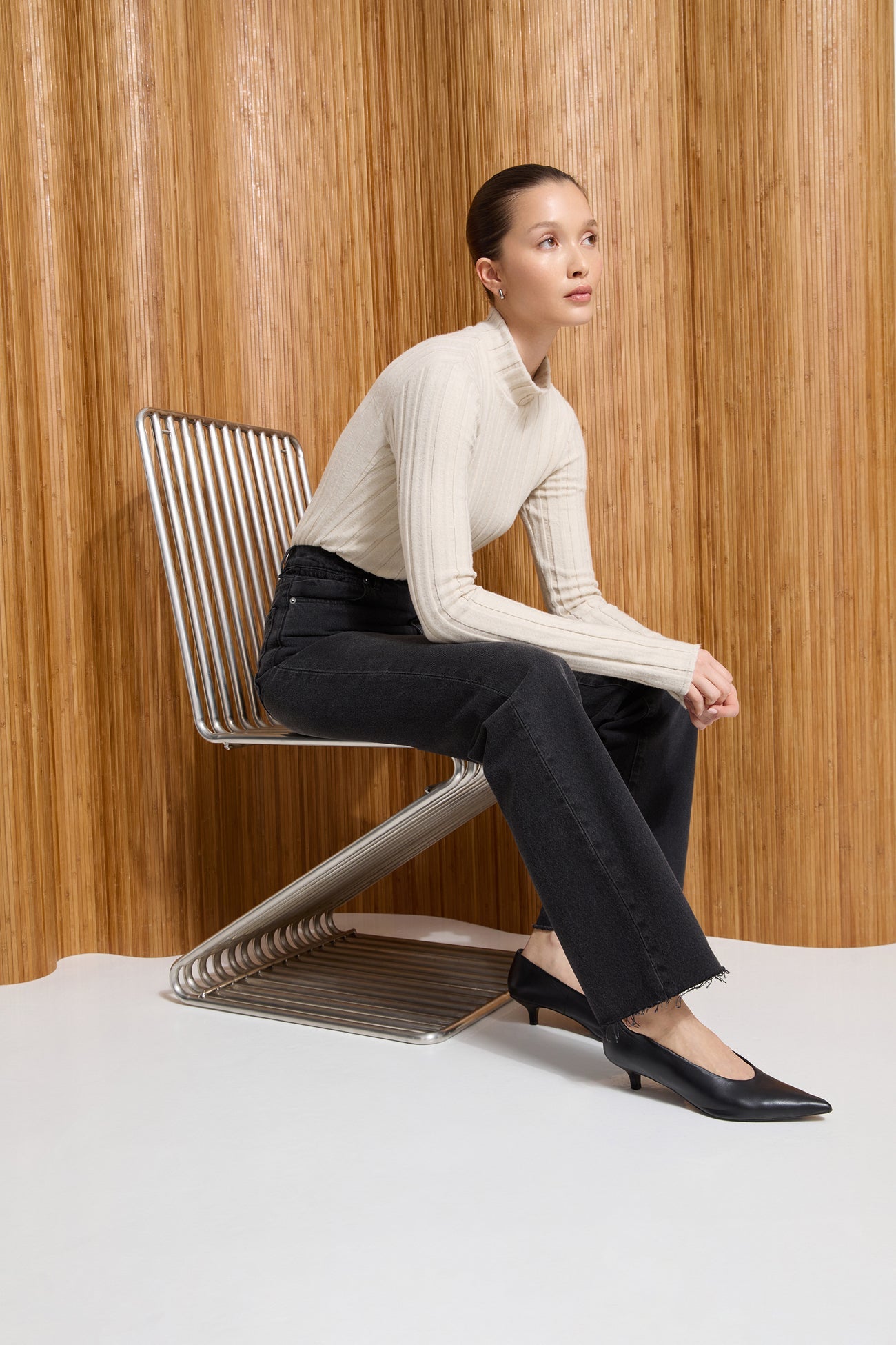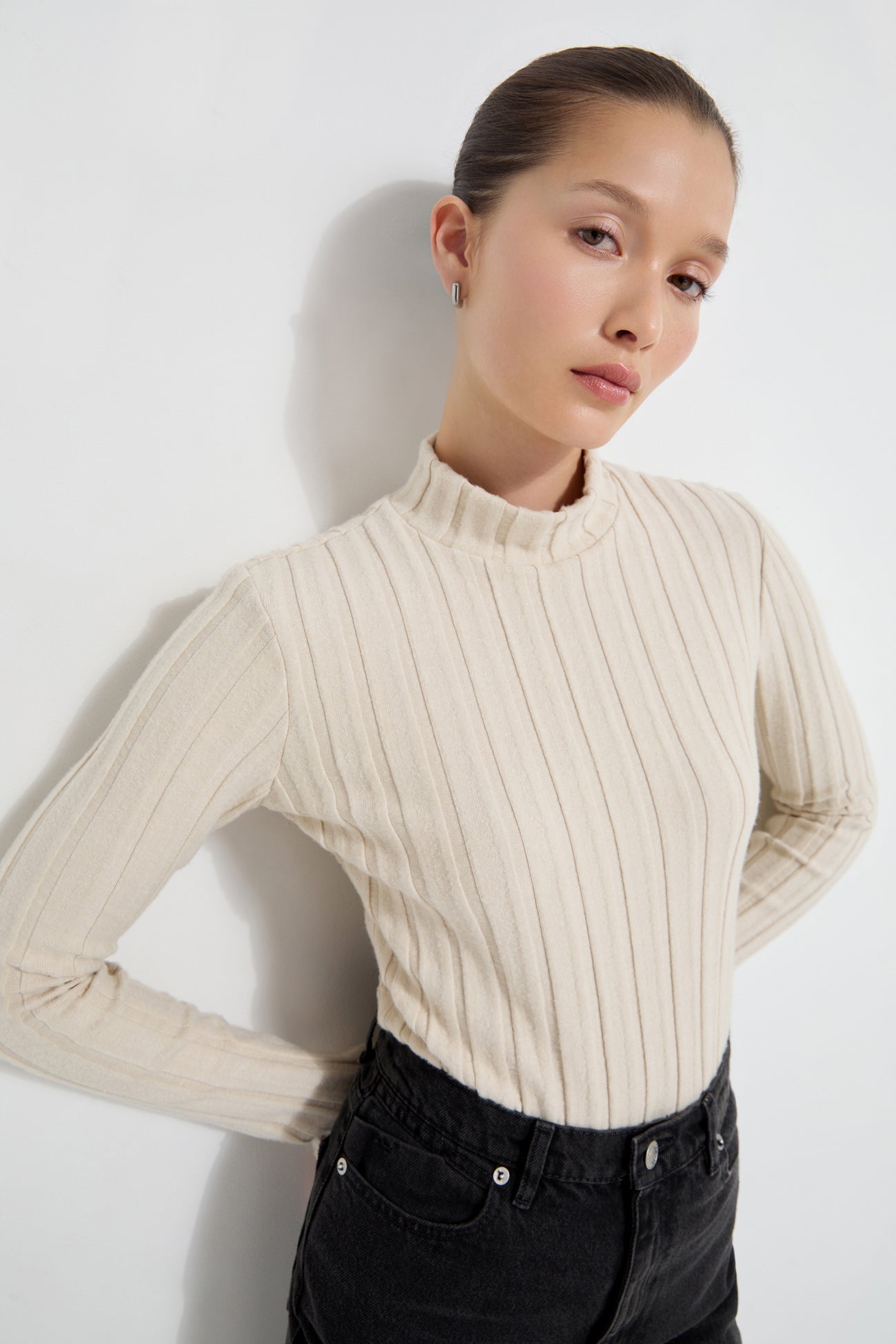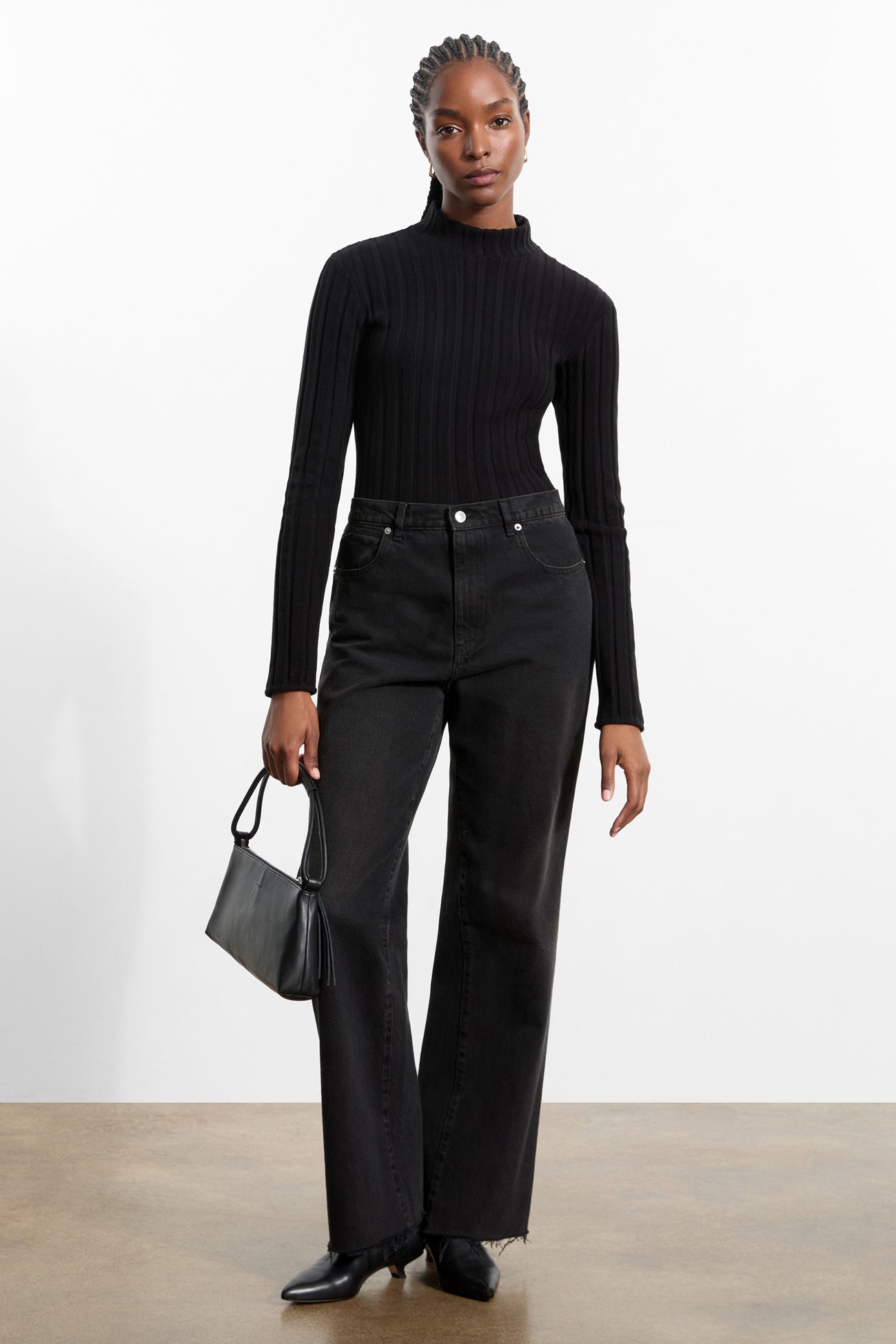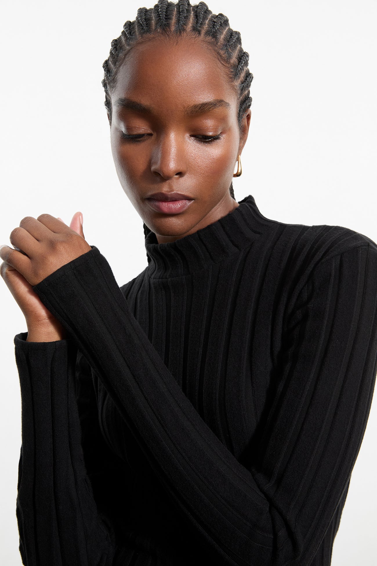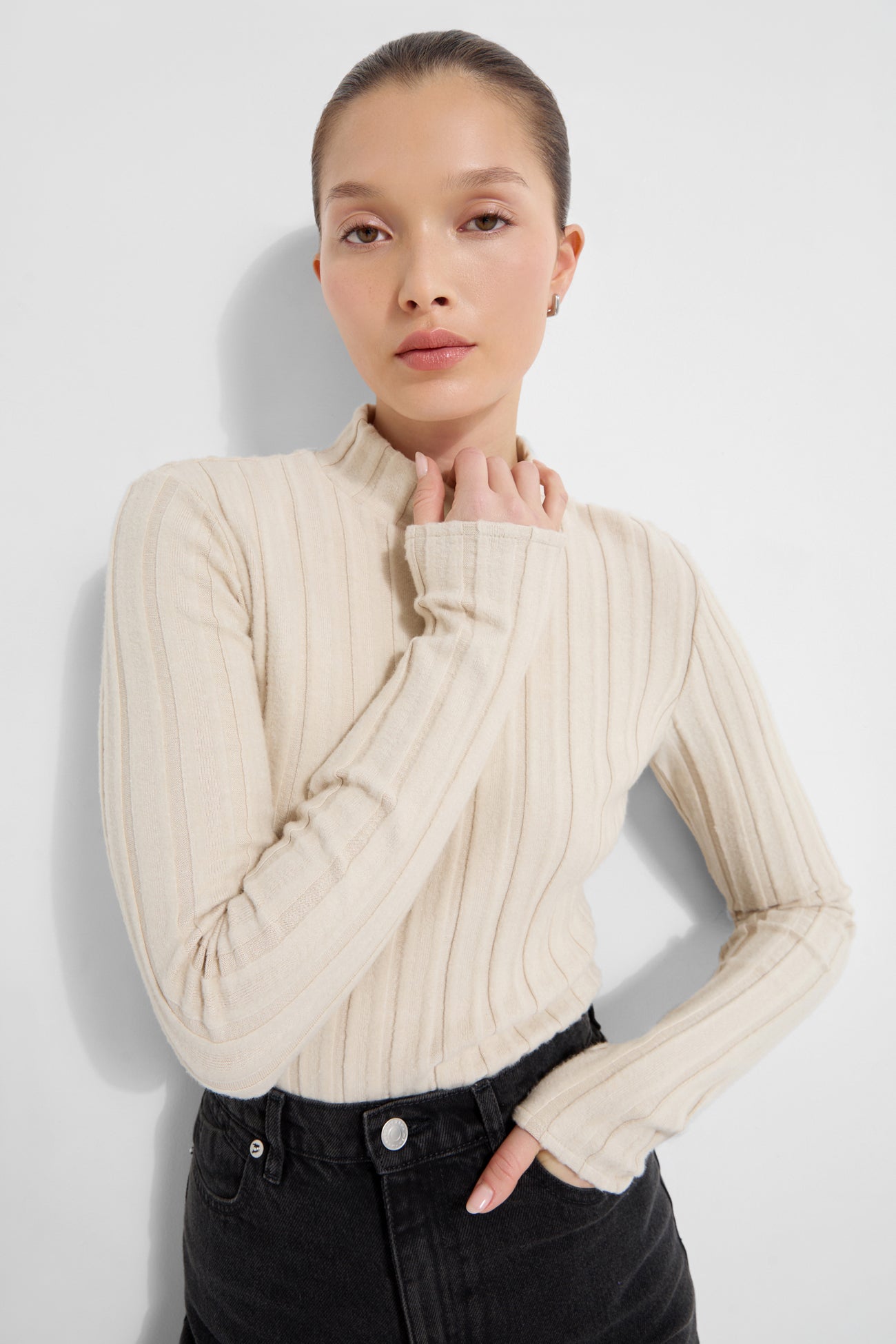 Keep your look cozy but eye-catching in Samia. This mock-neck top is handcrafted from brushed European ribbed jersey that's pure softness. plus with a little stretch. With long sleeves and sophisticated ease. she's sure to be a staple in your closet for both weekday and weekend rotations. SPLIT