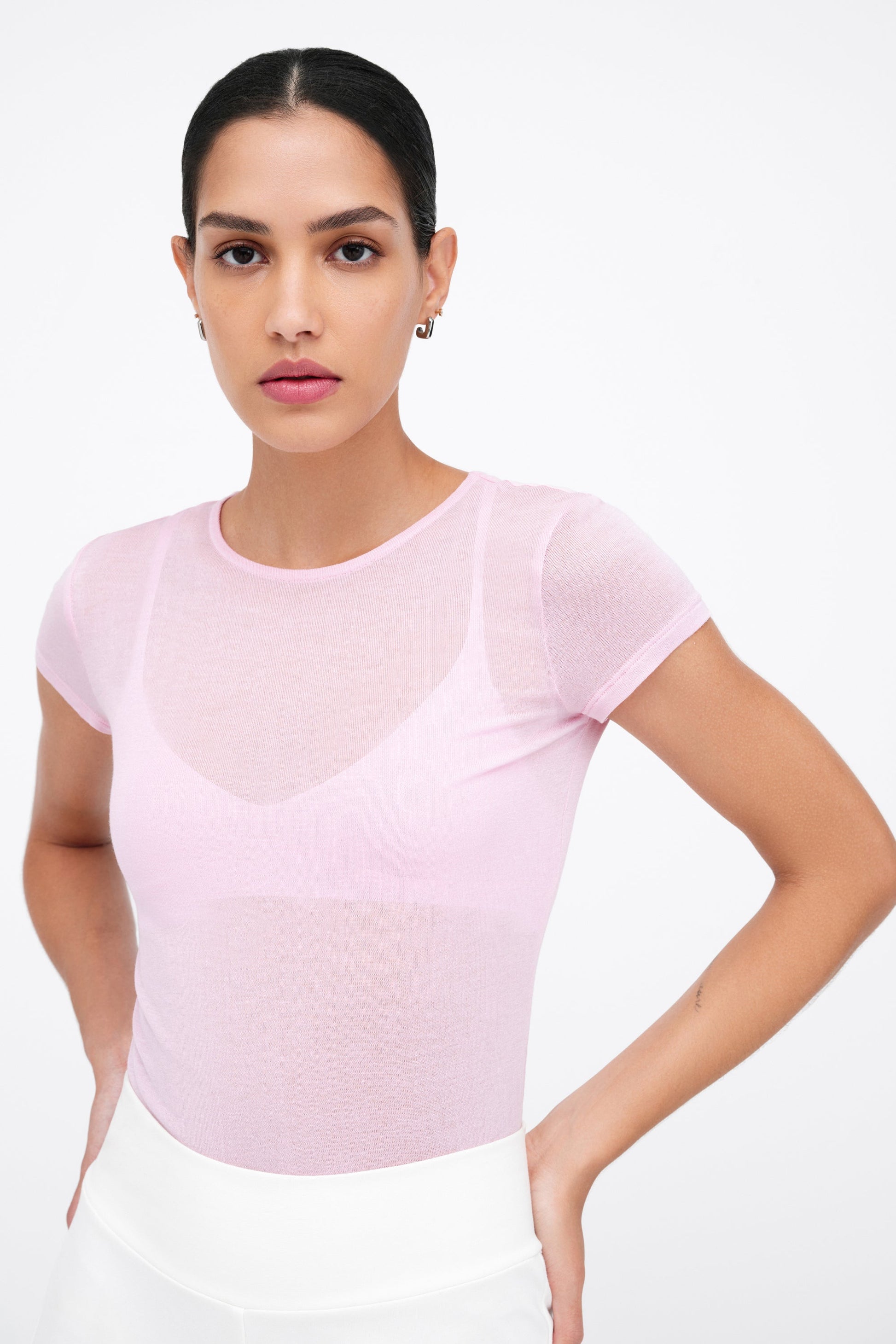A classic silhouette with a round neckline and short sleeves. What sets our Sara Tee apart is her soft. sheer European jersey fabric. with extra stretch for a customized fit. Perfect for layering—over or under—Sara is a versatile tee that will brighten up your basics.SPLIT