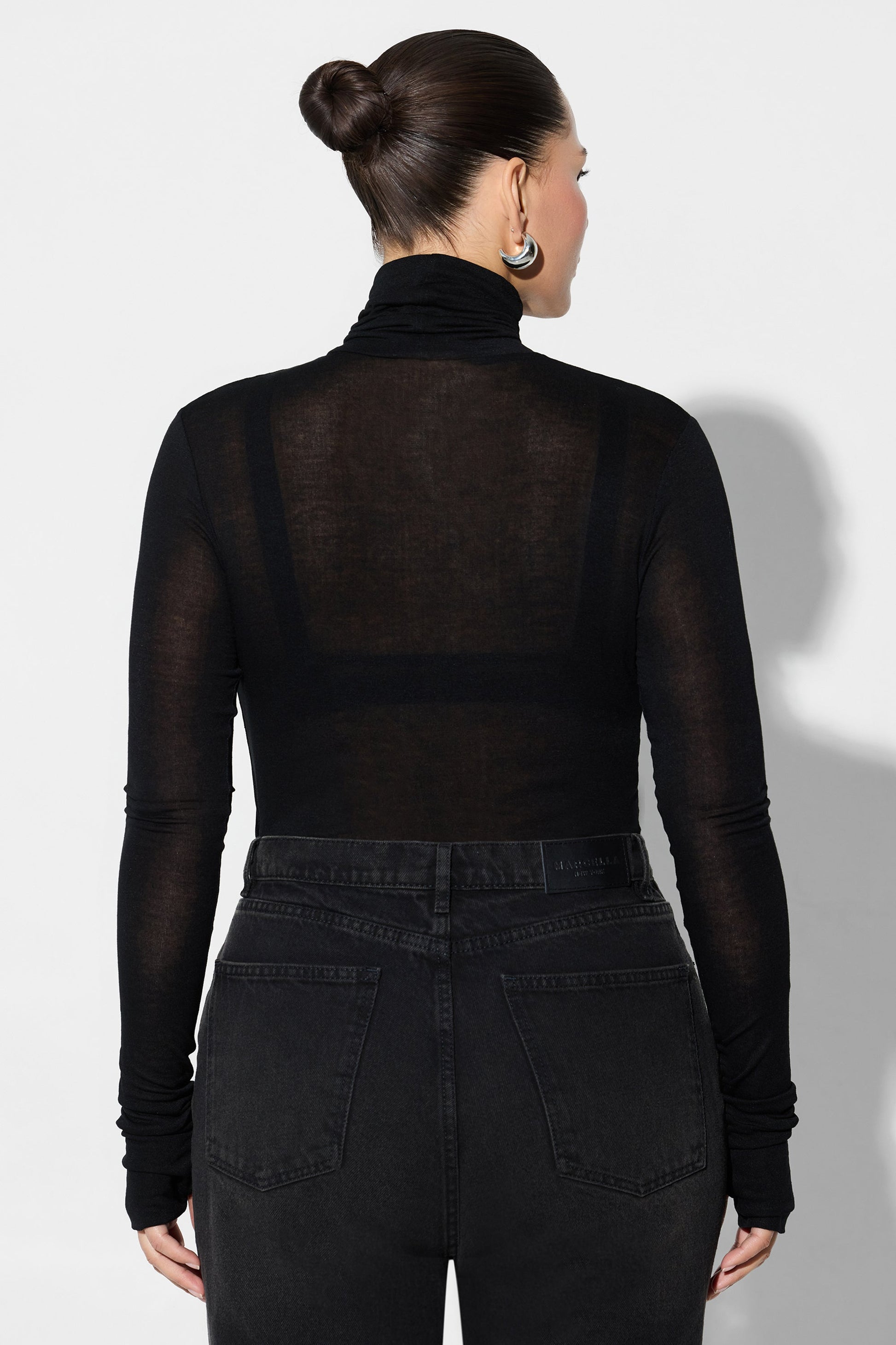 Meet our favorite multi-tasking silhouette. the Eloise Sheer Turtleneck. She features several signature Marcella details—including thumbhole sleeves and extra length around the torso. Crafted from our European sheer jersey for an ultra-light feel and body-loving fit. Eloise is casual yet easy to dress up—a true staple.