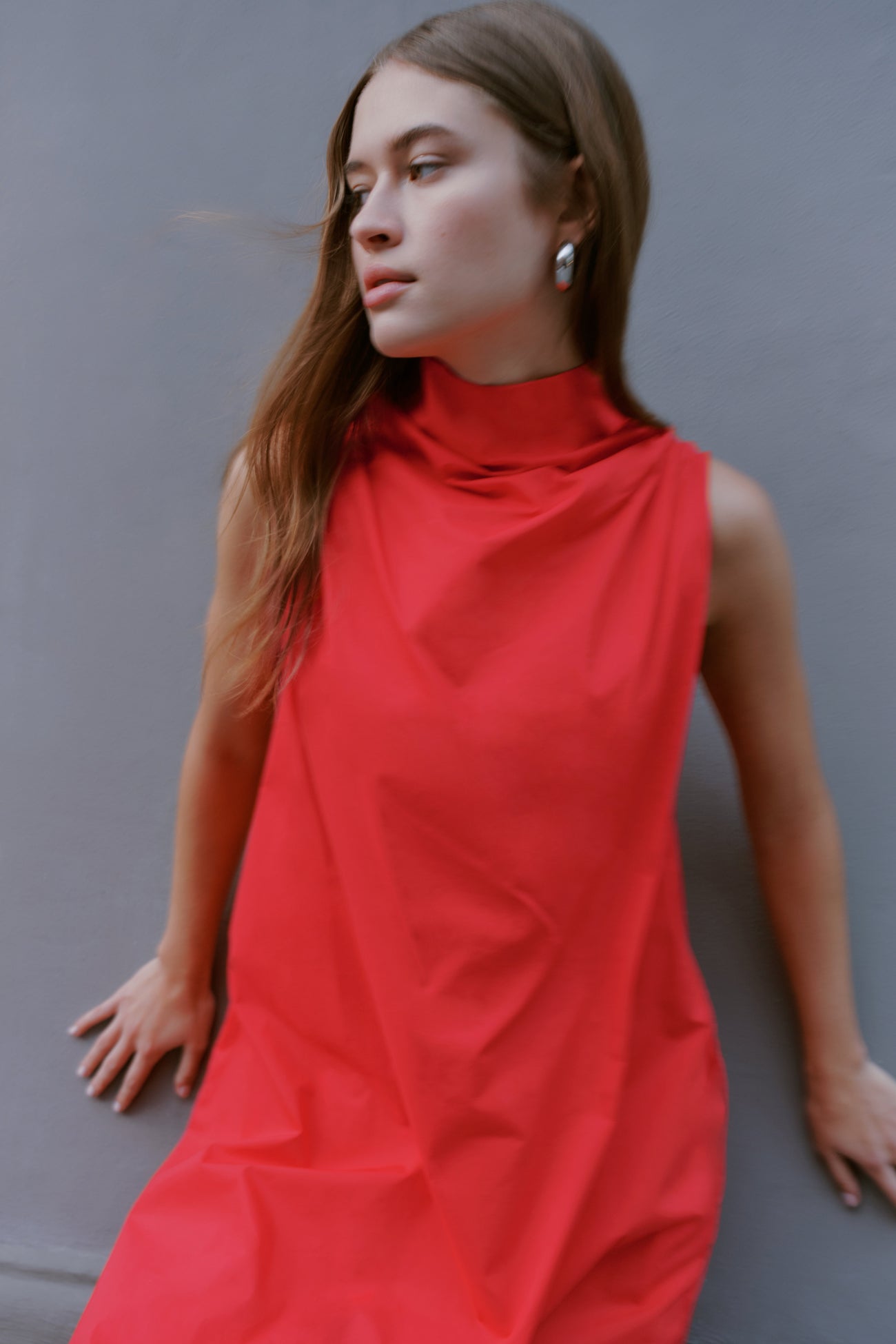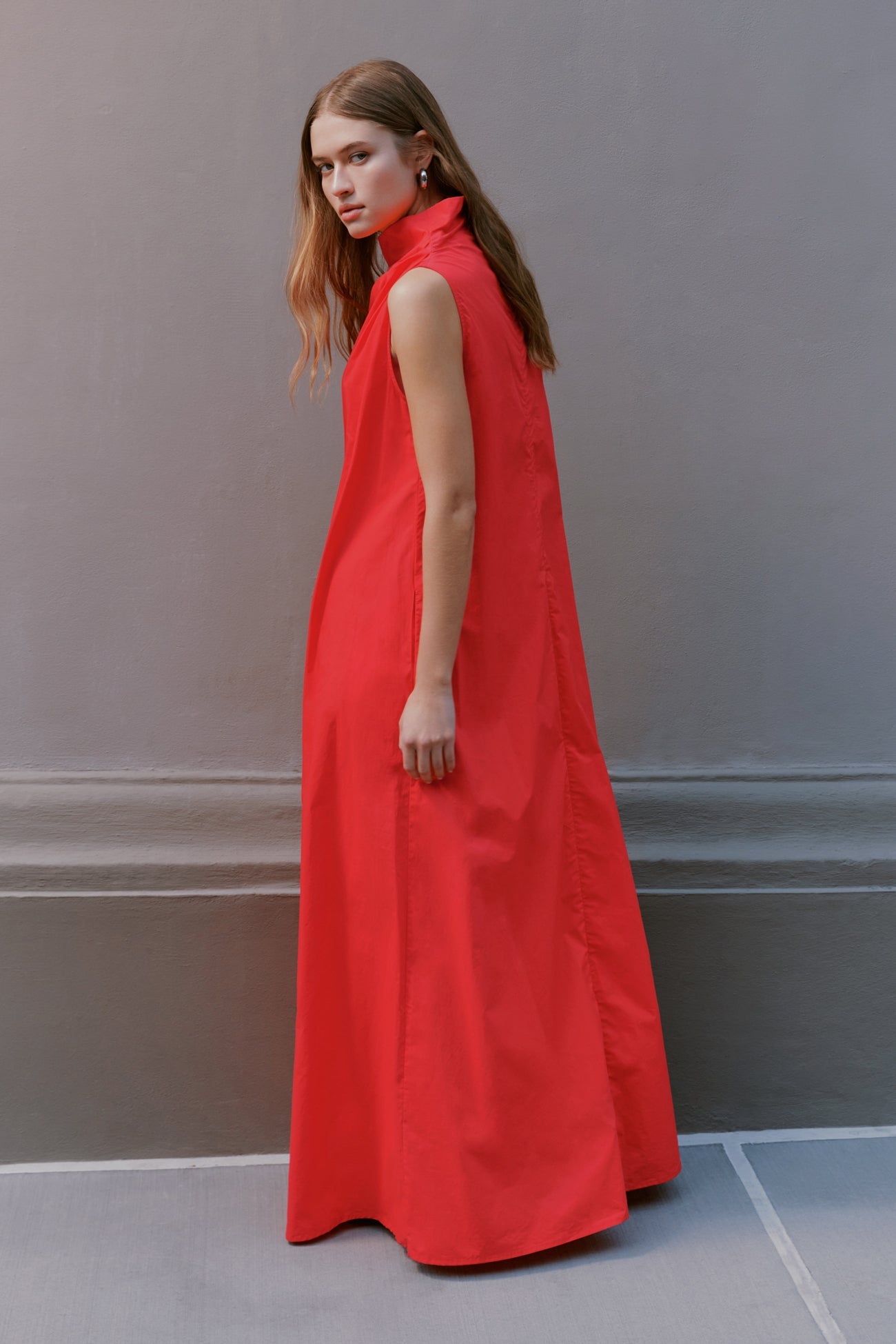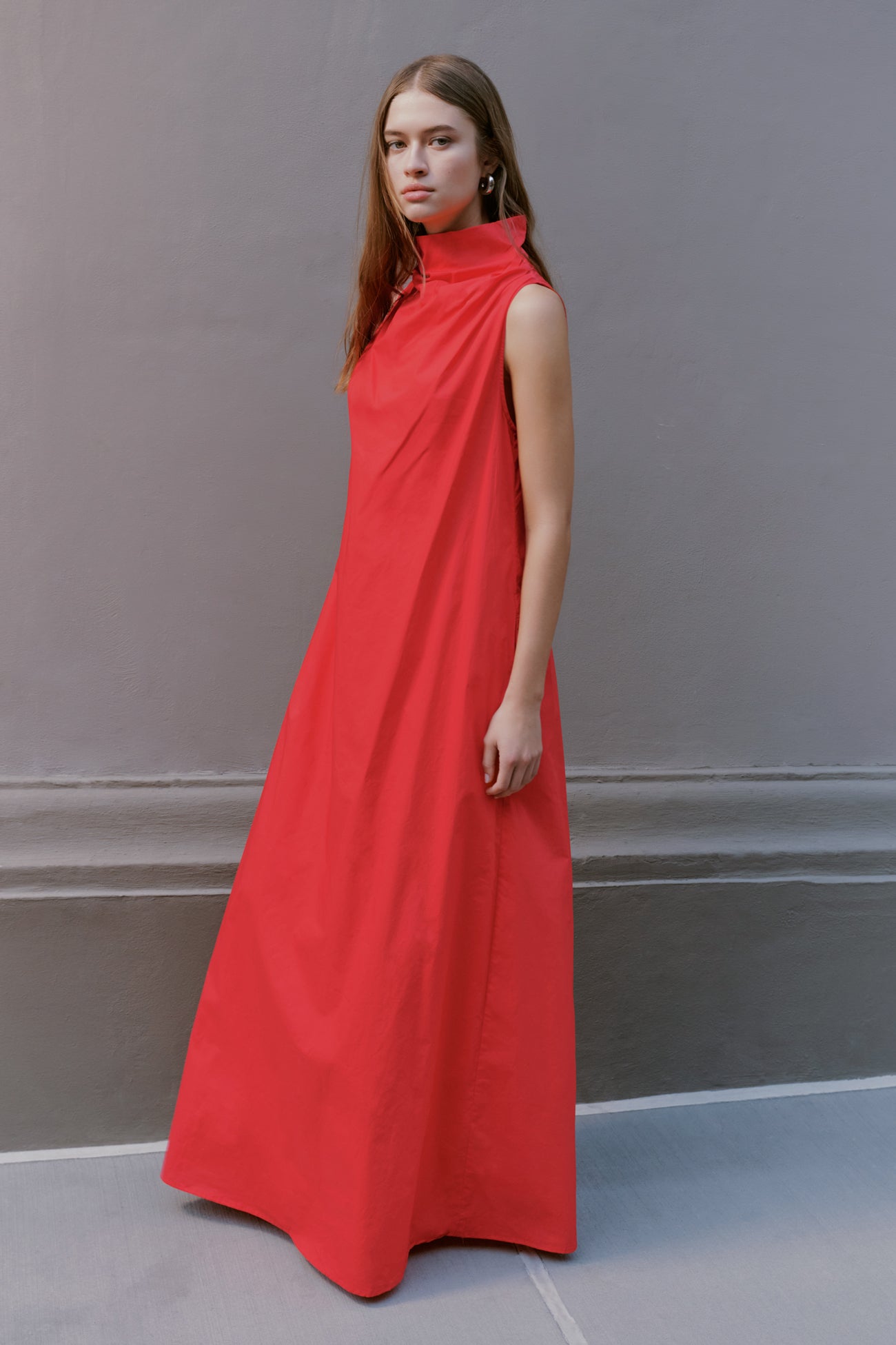 Our looser. structured maxi with a breezy silhouette. Fashioned from crisp and airy European poplin cotton. the Minna Dress features a wide. high neckline that gathers gorgeously near the shoulders. while a hidden back zip keeps her look clean and uncluttered. and two side pockets offer the perfect finishing touch. Wear Minna relaxed or cinched with a belt at the waist—you'll receive a narrow cotton tie belt with your order at no extra charge which can be used for styling. if desired.