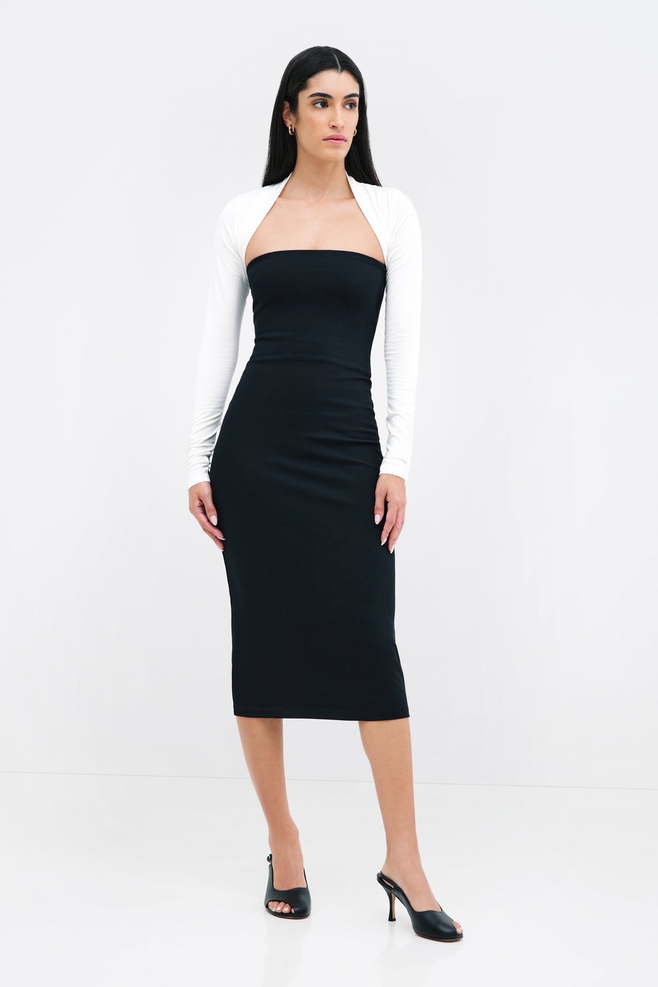 Our Tatiana Bolero elevates the classic shrug with a modern. minimalist silhouette. She features a geometric front that beautifully frames your neckline and slimming long sleeves that cover the arms. Fashioned from our soft. high-stretch and sustainable European jersey. she effortlessly comes on or off. One of our all-time best sellers. Tatiana's the perfect evening accent.