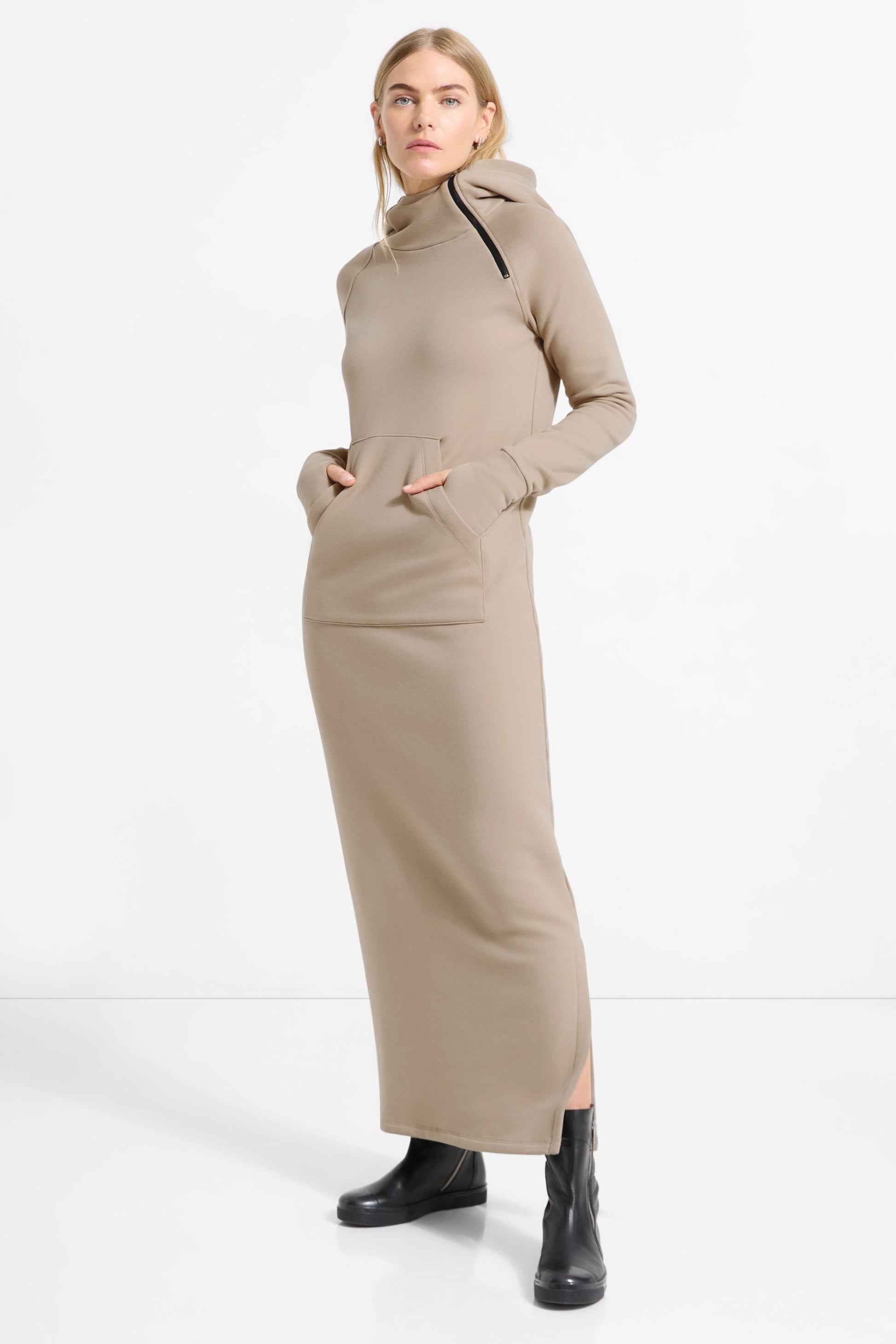 Our Tompkins Sweatshirt Dress is proof that maximum comfort can still catch the eye. Fashioned from our midweight. breathable European french terry. an ever-so-soft sweatshirt fabric. she features an oversized hood with an asymmetric zip for visual interest. Thumbholes at the sleeves and a front patch-pocket are there to warm your hands. Tompkins' side hem is also detailed with a slit so you can show off your boots.