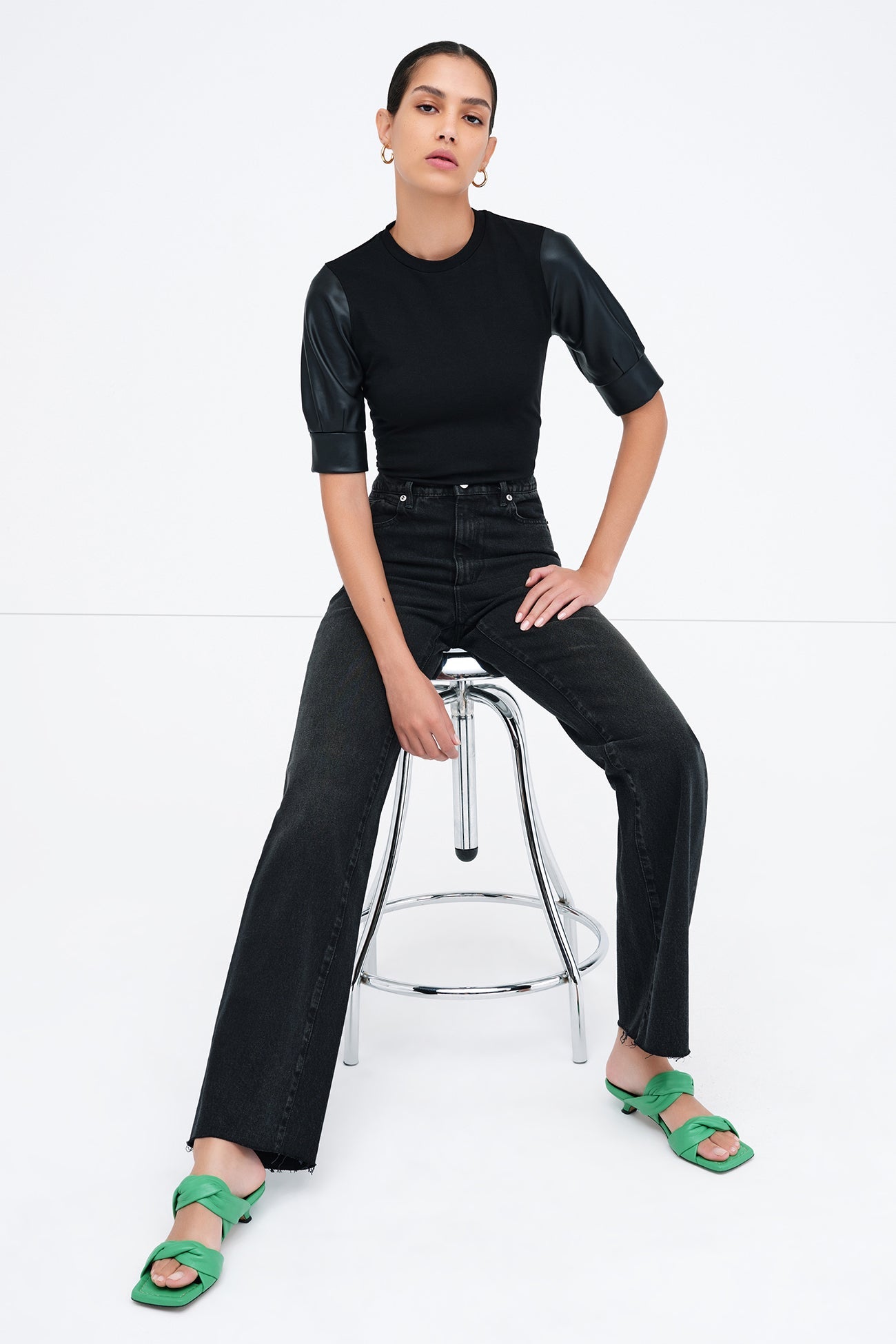 Our Trove Top radiates feminine edge. Handcrafted from structured and mid-stretch European ponte. she offers a body-hugging crewneck silhouette with statement faux leather puff sleeves that taper into a cuff. Day to night. casual to cocktail �Trove will have you feeling stylish and unique no matter the setting. SPLIT