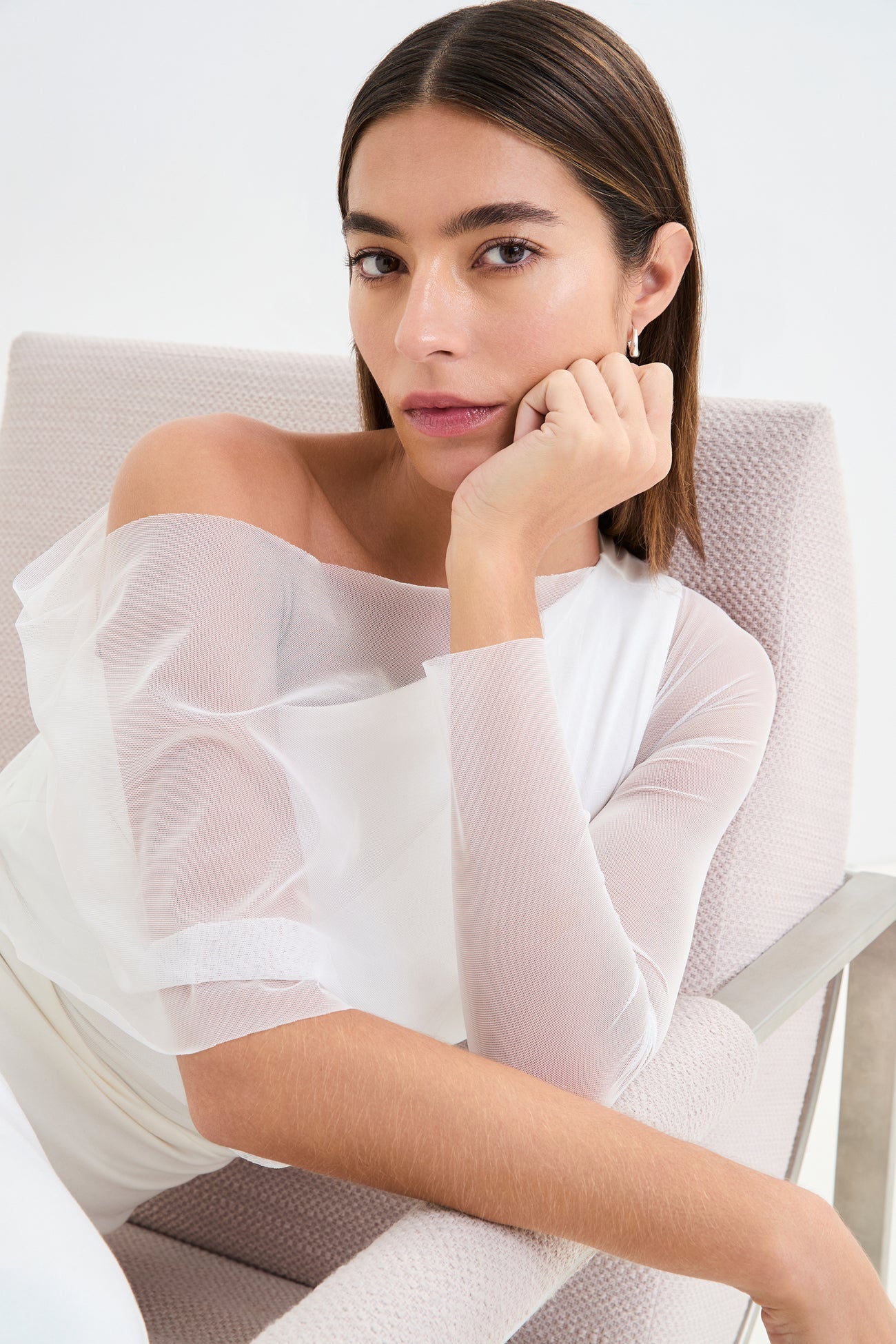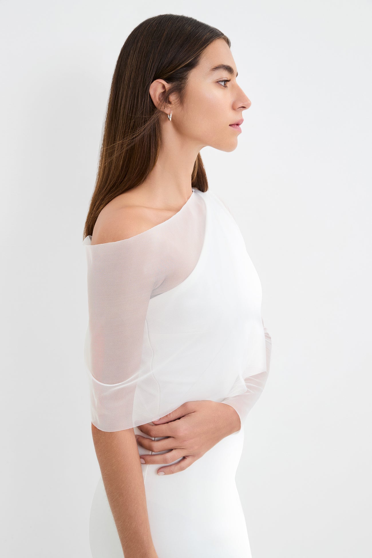 Meet our iconic Valeria Dress. A full-length evening gown. she's back and better than ever with an enhanced design. Mainly from wrinkle-resistant. mid-stretch European ponte for a body-hugging fit. her one-shoulder neckline features a light-as-air. soft mesh overlay that floats down one arm. We've enhanced Valeria to offer more stretch. better movement and superior comfort while maintaining perfect form—no matter how long the night lasts. SPLIT