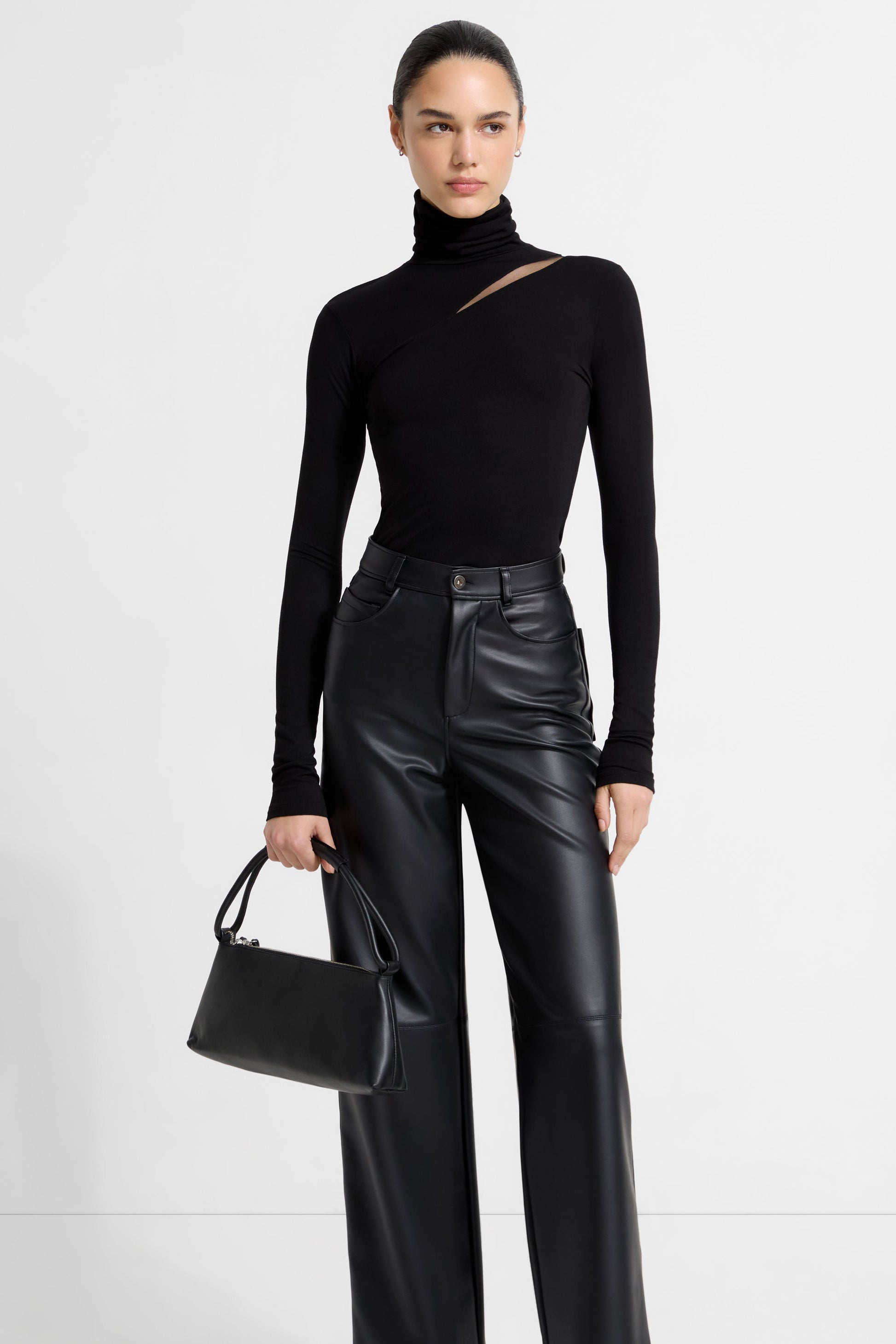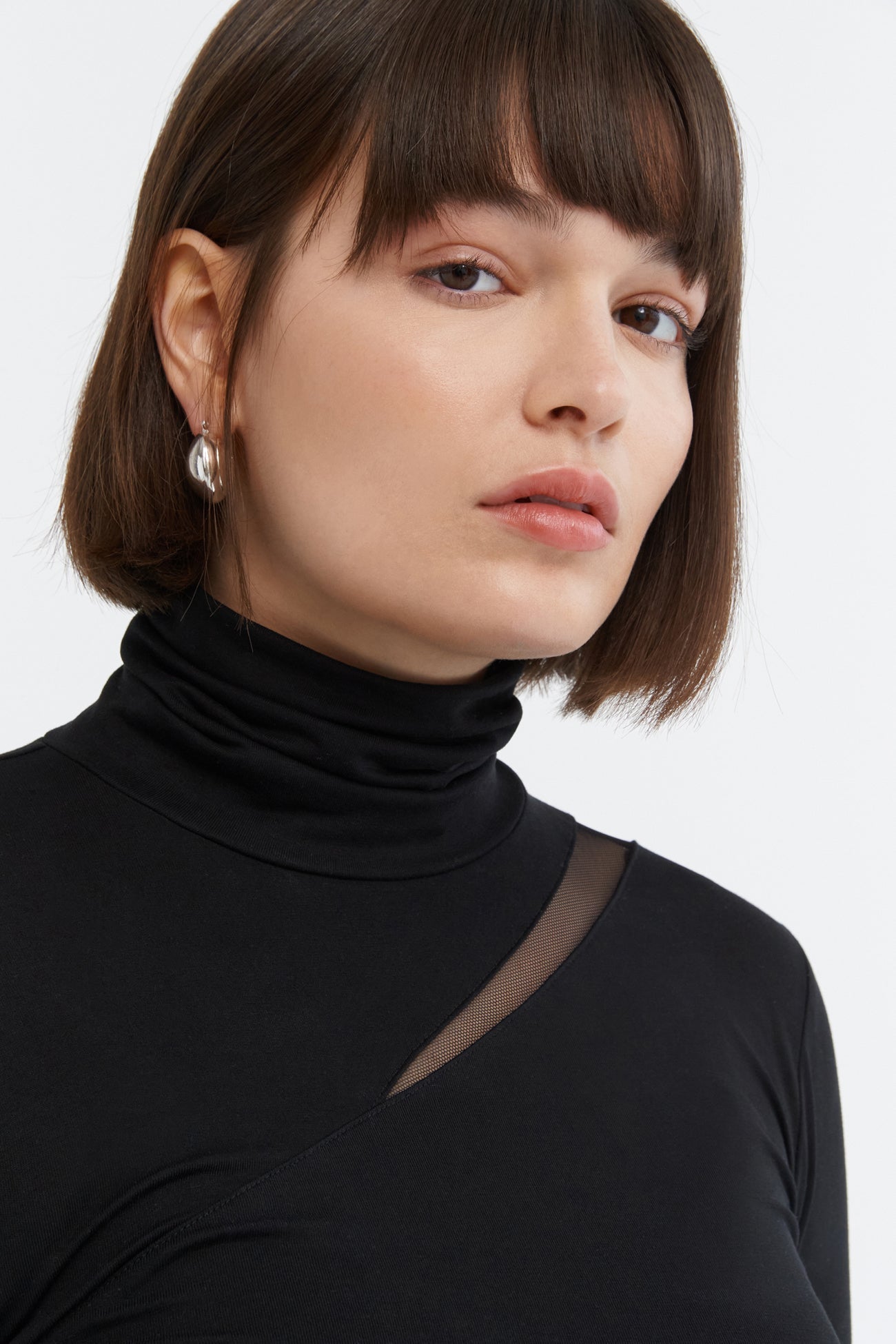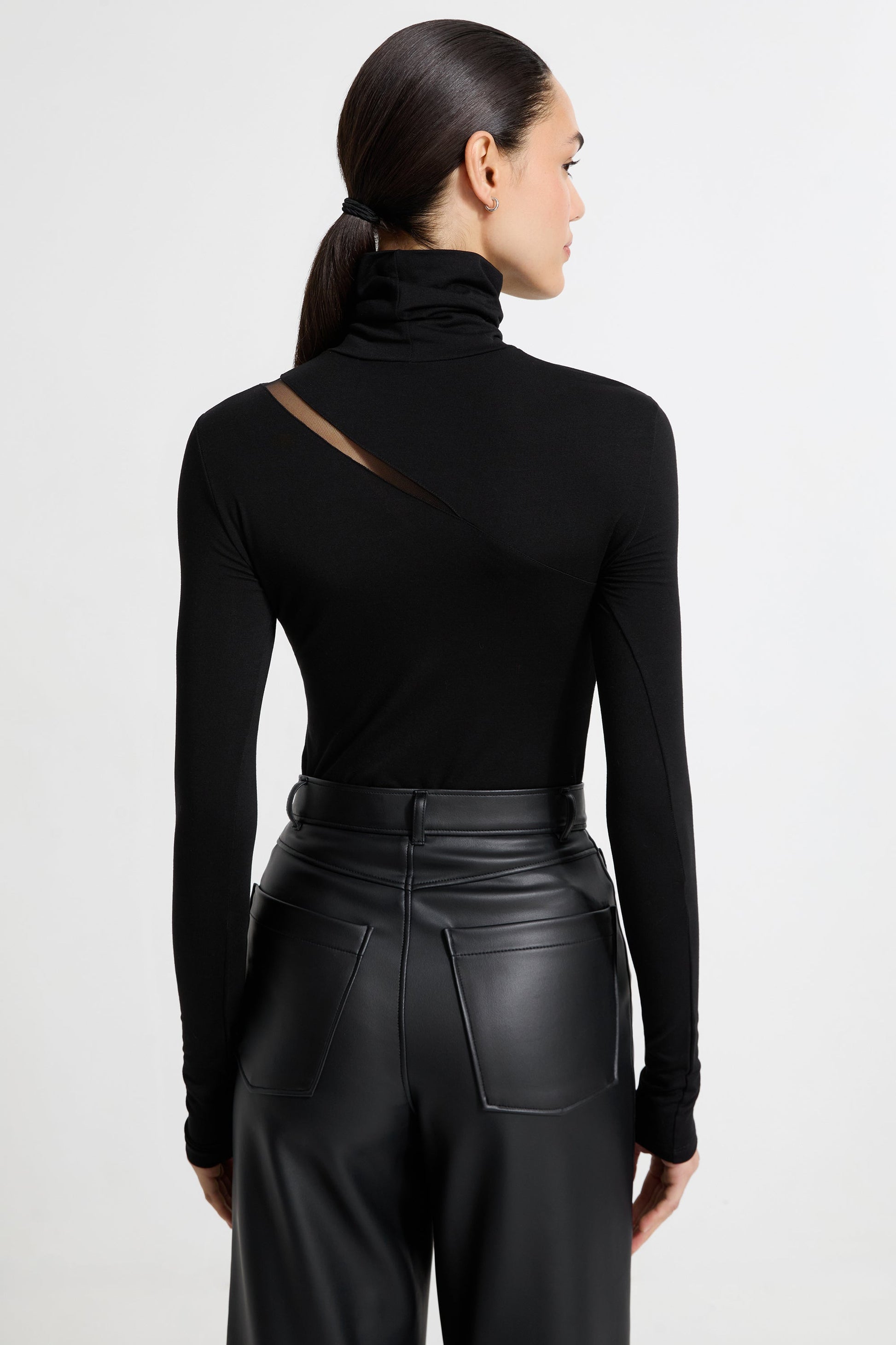 Our Vee Top is an everyday essential offering the subtle element of the unexpected. An ever-so-comfy turtleneck tailored from our high-stretch. sustainable European jersey. she features a sharp. asymmetrical cutout in soft. luxe mesh at the shoulder. Extra-long sleeves and a body-hugging fit complete this minimalist must-have for any setting.SPLIT