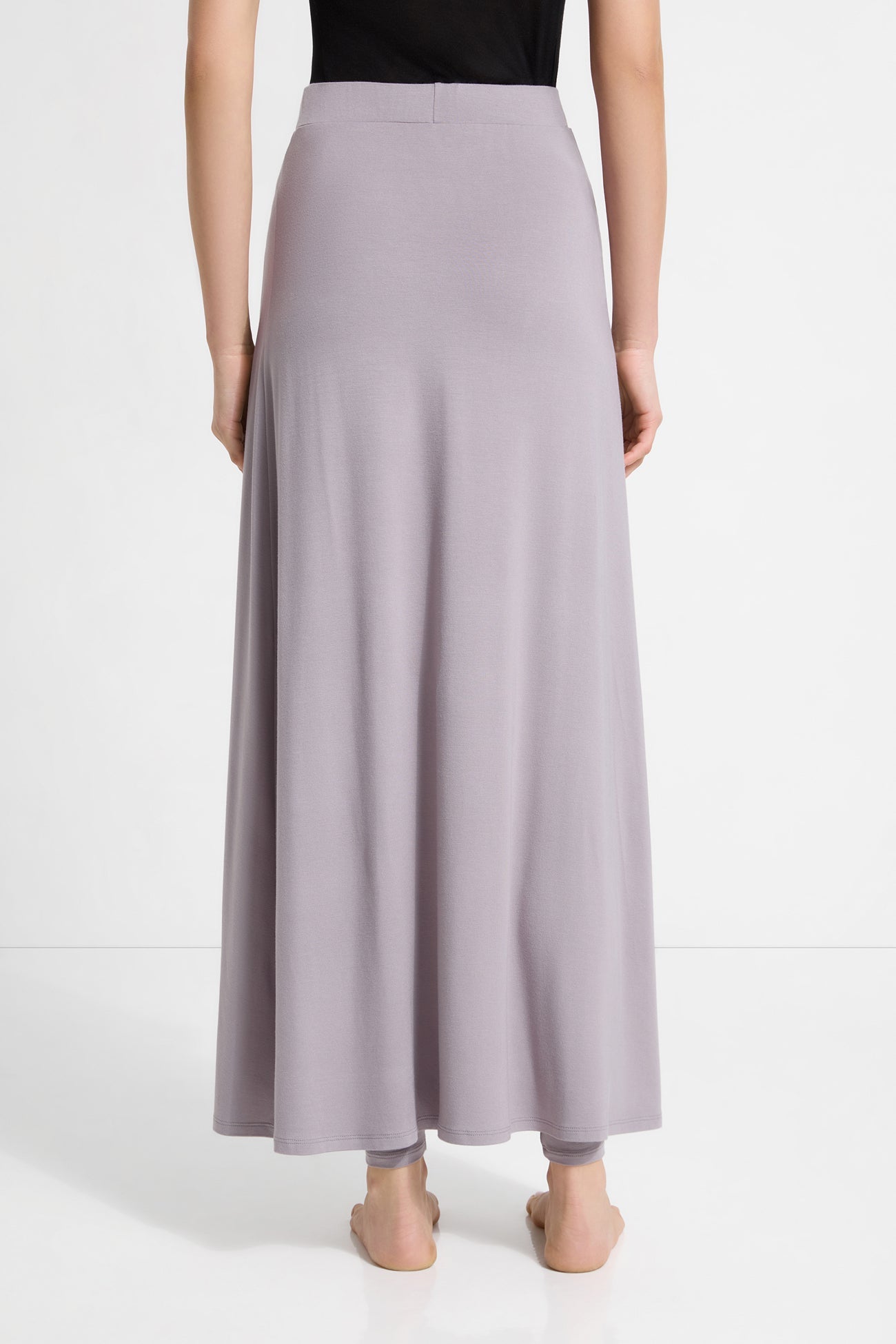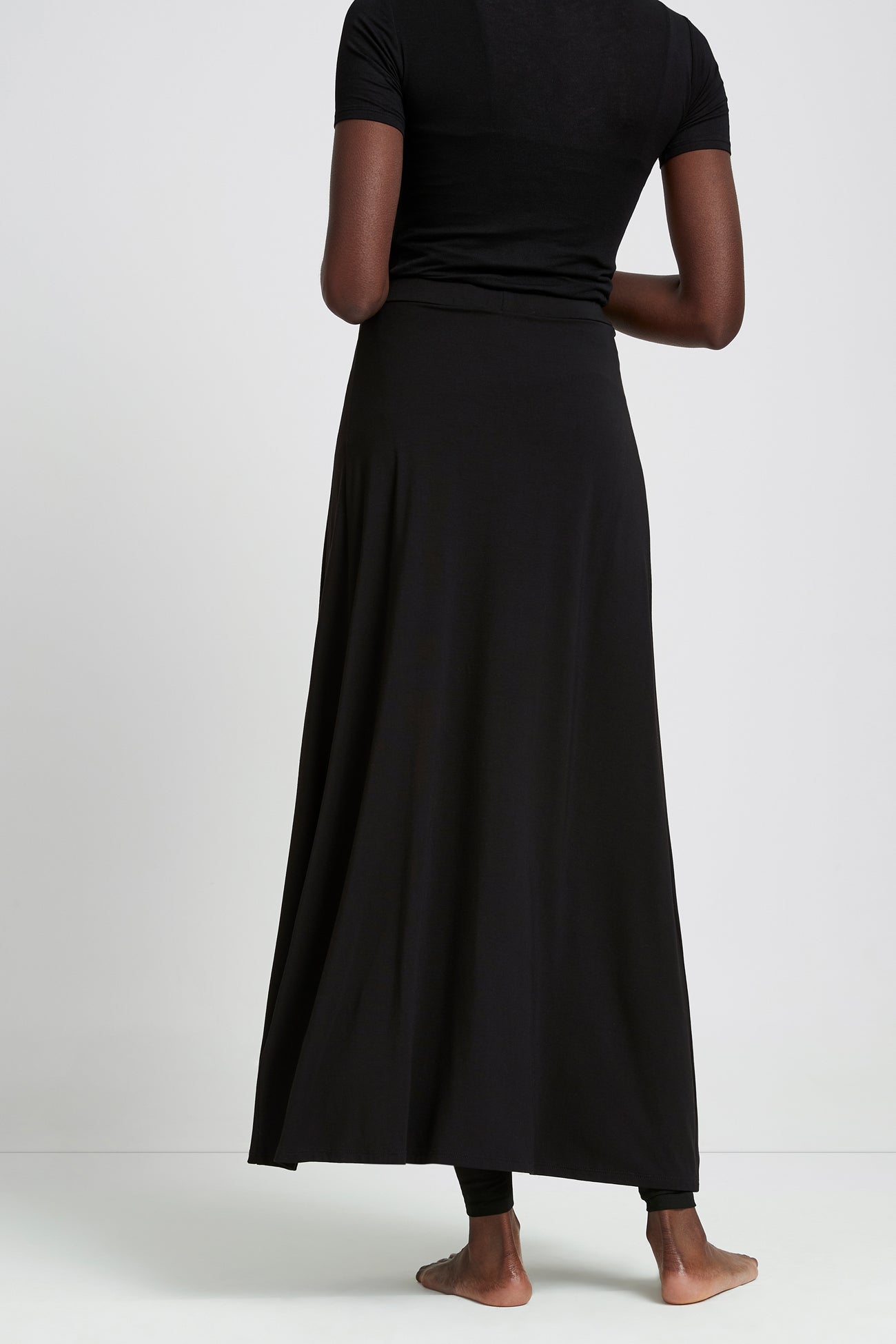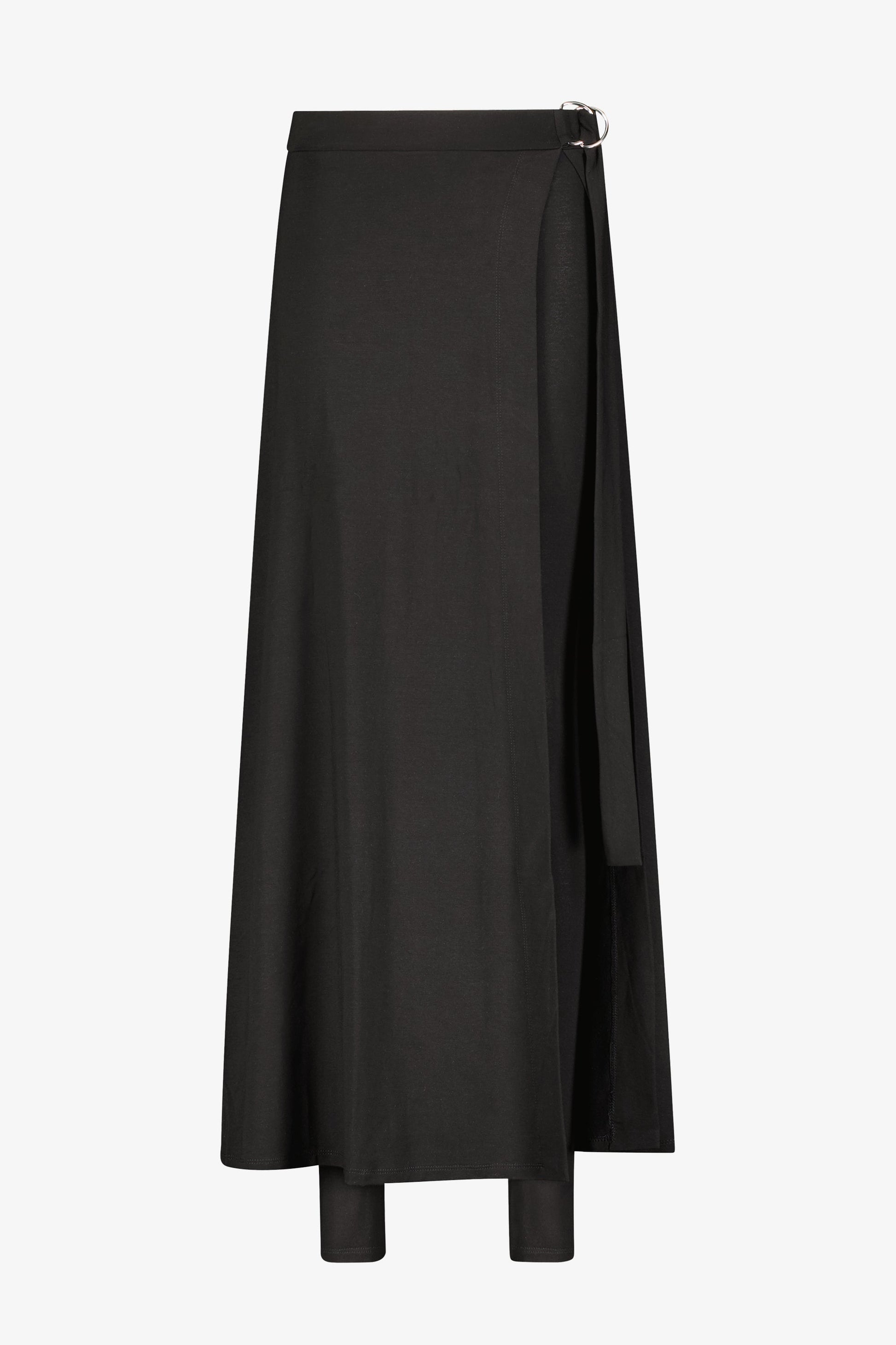 Stand out in our Waverly Pants. Elevated black skirt pants like you've never seen before. they're a pair of fitted leggings wrapped by an open skirt (featuring a sash belt and a double-ring buckle). giving you pants that look like a skirt. All the comfort of leggings with the flash of an open leg skirt. From our beloved high-stretch. soft and sustainable European jersey. Waverly offers gorgeous movement and an entirely unique silhouette. SPLIT