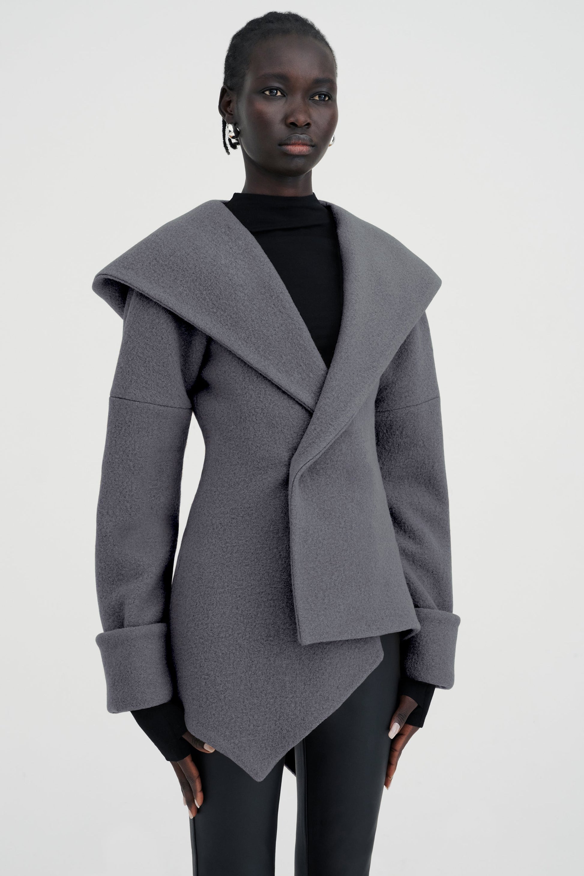 Stay stylish and warm at once in Kyoto. Crafted from 100% virgin wool for cooler temps. she features an exaggerated shawl collar that transforms into an oversized hood. while her asymmetric hem and curved back panel offer structure. With fitted. wide-cuffed sleeves and a hidden front button closure. Kyoto has a sleekly modern look that's effortless to style (while being ever-so-cozy). SPLIT