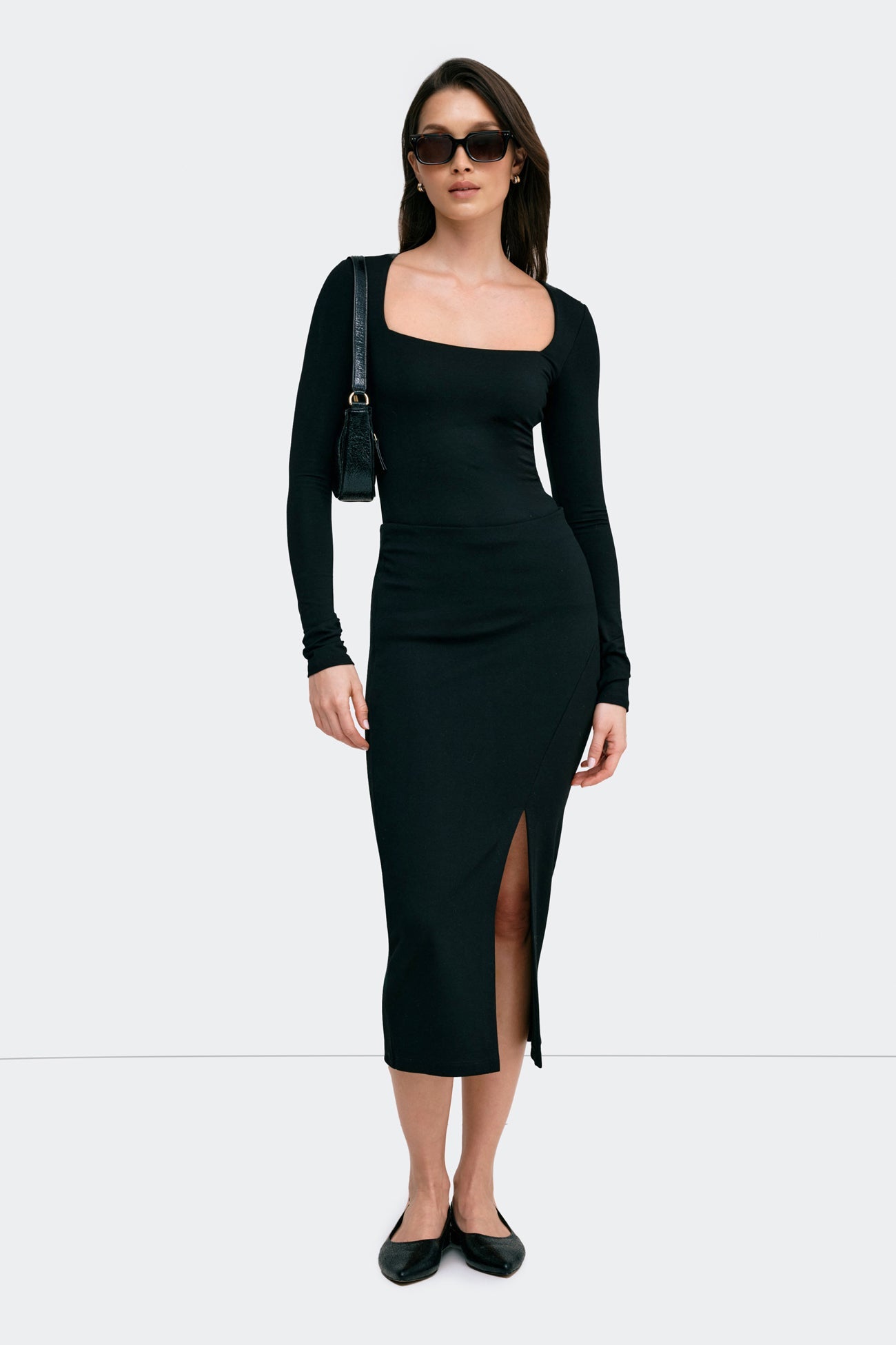 Meet Yvonne. our do-it-all top appropriate for any occasion. She features a hypnotic square neckline and long sleeves for that edgy touch. with a double layer of our silky. high-stretch and sustainable European jersey lining the chest area providing additional support. Sexy and sophisticated at once. Yvonne's ready to tag along to anything. SPLIT