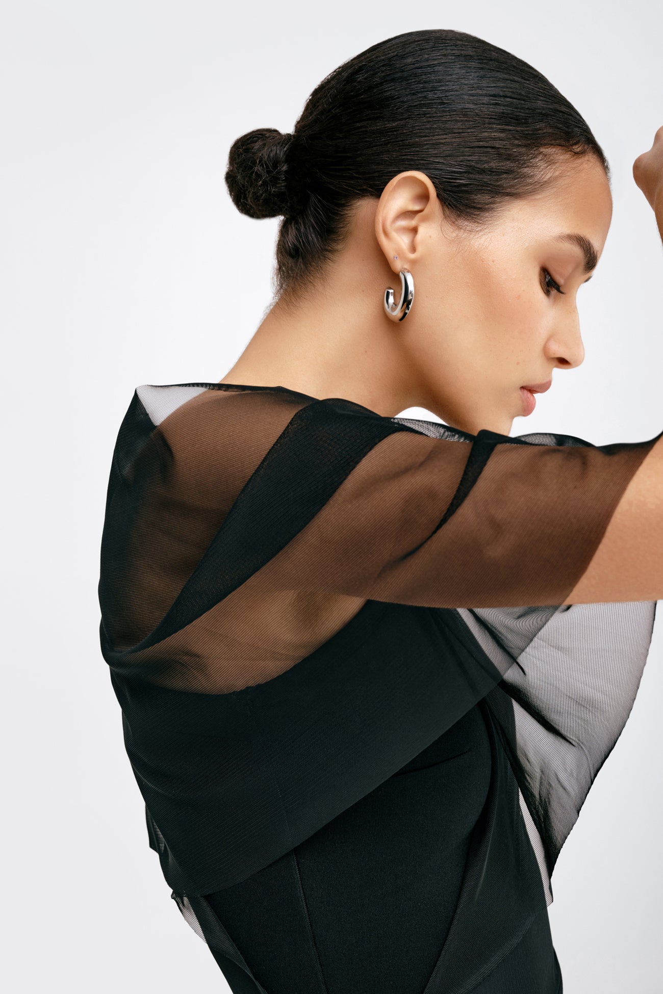 Inspired by our bestselling Valeria Dress. Zinnia features the same effortless elegance as her big sister in an updated. sleeveless design. Maxi length with a gentle A-line skirt and fitted bodice. Zinnia features an asymmetrical one-shoulder silhouette. with a light-as-air mesh layer at the neckline and over one arm. A high slit on the leg confirms Zinnia's credentials as a black dress that delivers glamour and drama in equal measure.SPLIT